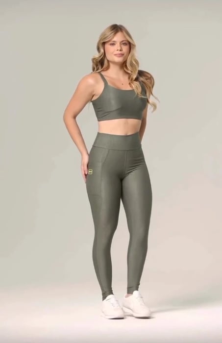Conjunto em poliamida canelada premium com bojos removíveis e bolso na calça.