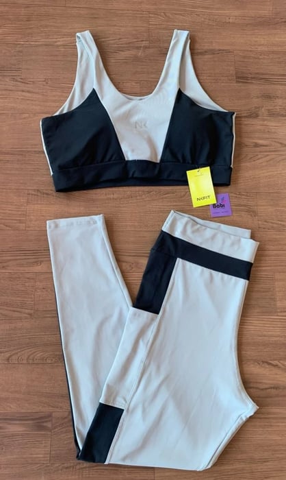 Conjunto fitness NKFIT com top e legging, cós alto e detalhe contrastante que valoriza a silhueta com estilo, conforto e sustentação.