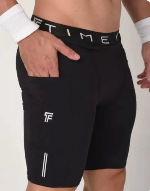 Alta compressão em poliamida, com bolso lateral funcional e elástico personalizado. Ideal para treinos intensos.